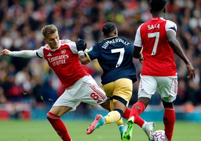 阿森纳排出433进攻阵型。萨卡、哲凯赖什和特罗萨德的进攻三叉戟联袂出击。厄德高、赖斯和埃泽组成3中场。廷贝尔、萨利巴、加布里埃尔和卡拉菲奥里4后卫首发出战。戴维-拉亚担任首发门将。马丁内利、梅里诺和本-怀特坐在替补席待命。