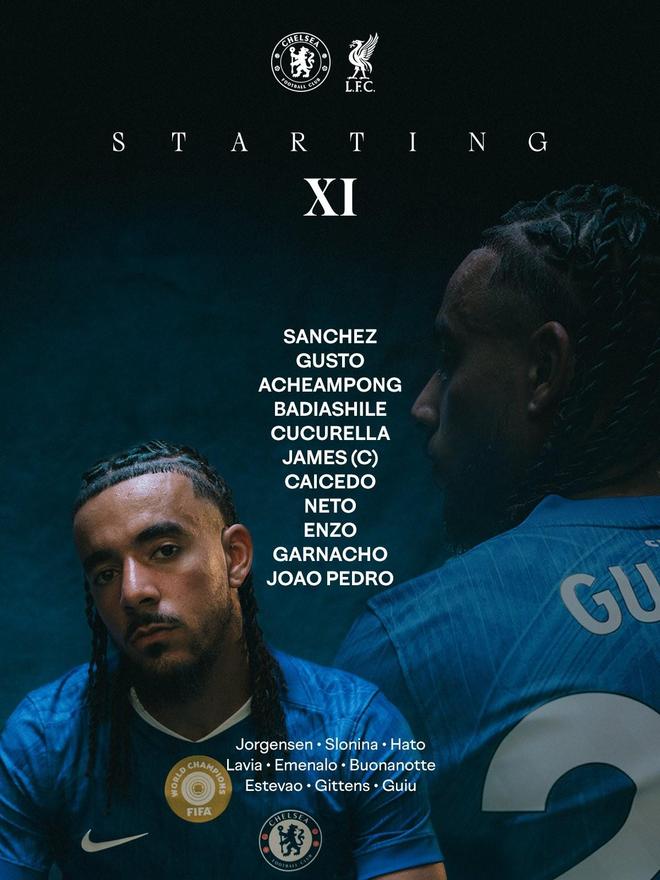 切尔西首发:1-桑切斯、27-古斯托、34-阿昌庞、5-巴迪亚西勒、3-库库雷利亚、24-詹姆斯、25-凯塞多、8-恩佐、7-内托、49-加纳乔、20-佩德罗