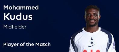此役客场对阵利兹联,首发出战的库杜斯在上半场助攻马蒂斯-特尔破门,下半场库杜斯自己打入一球,收获热刺生涯处子球,帮助球队最终2-1击败对手。