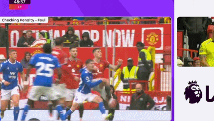 上半场补时第3分钟,塞斯科禁区内抬脚解围,结果踢到休姆,后者应声倒地,主裁判判罚点球。随后,视频助理裁判介入判罚,并且要求主裁判回看慢镜头。